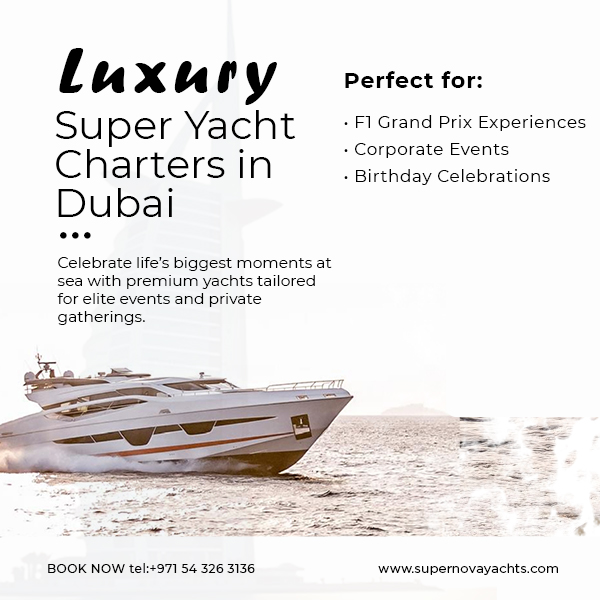 Supernova Yachts specializes in delivering luxury super yacht experiences designed for Dubai’s most prestigious events. With a curated fleet and a dedicated team, Supernova Yachts ensures every F1 week charter reflects elegance, comfort, and flawless execution.